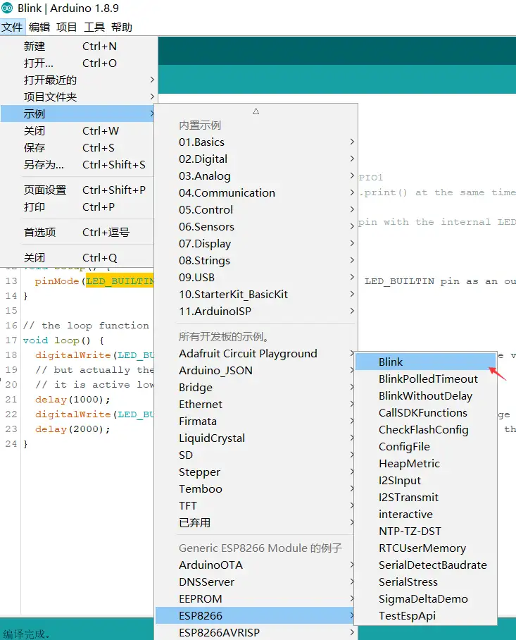 将 esp8266 接到电脑上,在 Arduino IDE 中选择 示例
