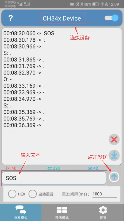 上面是使用 Arduino IDE 的串口监视器给 ESP8266 发送数据,这样就离不开电脑,使用场景收到了限制。我们可以在手机上下载一个串口调试工具,然后通过 OTG 功能线将 esp8266 连接到手机上,这样就可以用手机的串口调试工具给 esp8266 发送数据,随时都可以发出想要的摩斯密码信号了。